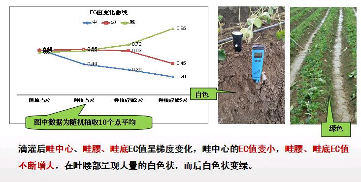 通過(guò)EC值不間斷測(cè)定,滴灌后種植畦EC值呈梯度式變化,滴灌當(dāng)天,畦中心點(diǎn)EC值為0.65,隨后慢慢降低,5天后降為0.25,潔凈度達(dá)飲用水標(biāo)準(zhǔn)(南寧市自來(lái)水EC值為0.28),而畦底的EC值上升為0.95.同時(shí)大量氯鹽和重金屬排出,土壤經(jīng)實(shí)驗(yàn)室化驗(yàn)發(fā)現(xiàn),種植畦內(nèi)、外的土壤氯離子分別為6.9mg/kg和67.97mg/kg,說(shuō)明大量的氯鹽排出畦外,畦內(nèi)、外的有效鋅含量分別為3.07mg/kg和4.91mg/kg,其它重金屬如鎂、銅也有內(nèi)低外高的差異,說(shuō)明部分重金屬也被排出。研發(fā)還發(fā)現(xiàn),種植畦底生長(zhǎng)的雜草枯黃,有明顯的中毒現(xiàn)象,但種植畦內(nèi)潔凈的土壤確保了草莓苗的生長(zhǎng),成活率達(dá)100%,植株生長(zhǎng)健壯。